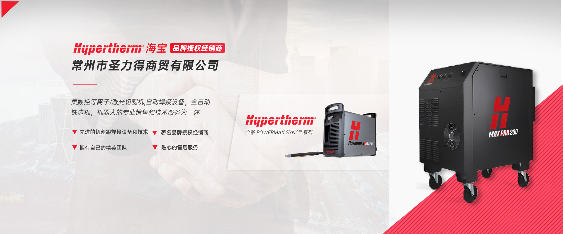 常州市圣力得商贸有限公司是一家集数控等离子/激光切割机,自动焊接设备,全自动铣边机,机器人的专业销售和技术服务为一体的公司。本公司是世界品牌Hypertherm(美国海宝)公司的授权经销商?! 」臼且恢Ъ际跷榷?、服务优良、富有朝气的精英团队。公司致力于将国外先进的切割跟焊接设备和技术介绍给中国的机器制造商和终端用户,并为用户提供品质的产品和完善的售后服务?! 」局饕硪韵虏罚骸 ?.美国海宝Hypertherm等离子机用电源,手持电源,原装易损件及备件  2.韩国赛拉科(CERACO)铣边机,南京顶瑞自动焊接小车  3.迈誓坦(MicroStep),日本田中(TANAKA),武汉法利莱(FARLEY-LASERLAB),江苏博大品牌等离子切割机,激光切割机及维修配件?! ?.美国海宝,美国飞马特,凯尔贝等原装正品易损件及配件  5.激光切割机,等离子切割机,火焰切割机升级,安装与调试及技术升级改造项目  6.机器人焊/切生产线  热忱欢迎广大用户前来询价及洽谈。
